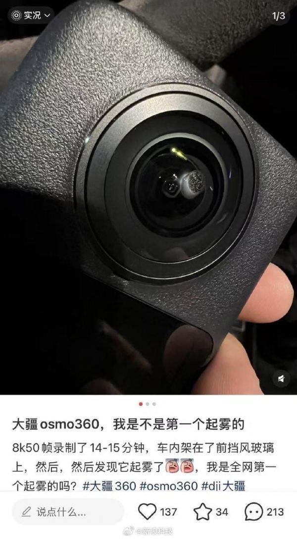 【#大疆全景相机被曝镜头起雾##影石创始人称大疆相机起雾是个例#】近日,有部分用户反馈大疆刚发布的旗下首款全景相机Osmo 360存在“镜头起雾”的情况。有网友在社交平台上发文称,称自己使用“8K 50帧(格式)录制了14-15分钟,车内架在前挡风玻璃上,然后发现起雾了。”