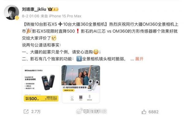 值得注意的是,另一家全景相机领域的明星企业影石创新(影石Insta360)创始人刘靖康8月2日深夜在微博发文庆祝同行大疆全景相机上市,他还表示“大疆的起雾只是个例,请安心选购”。