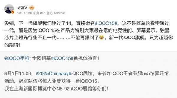 耐人寻味的是,就在同一天,iQOO 开启了超前预热。iQOO 手机宣布,全网招募「iQOO 15 首批体验官」,在 8 月 1 日 ChinaJoy 举行 iQOO 王者荣耀 5v5 惊喜开馆活动,现场招募 8 支队伍进行对战,冠军队伍每人获得一台 iQOO 15。