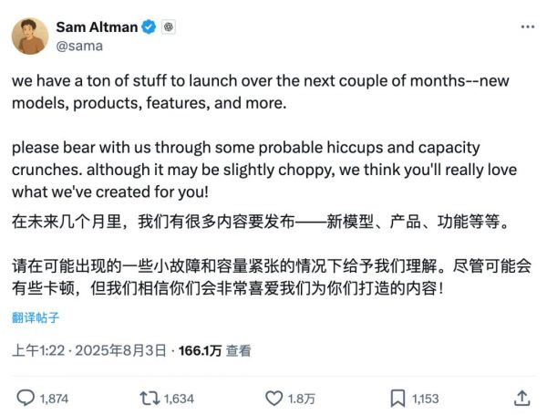 8月3日,奥特曼放出「风声」,未来OpenAI会有很多新模型、新产品和新功能发布。