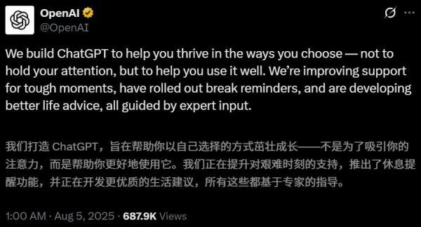 万众期待的GPT-5并未发布,OpenAI反而在ChatGPT周活用户突破七亿之际,公布了「防沉迷」新理念。这体现了其「助你成事」的核心目标:衡量成功的标准并非用户停留时长,而是问题是否被高效解决。