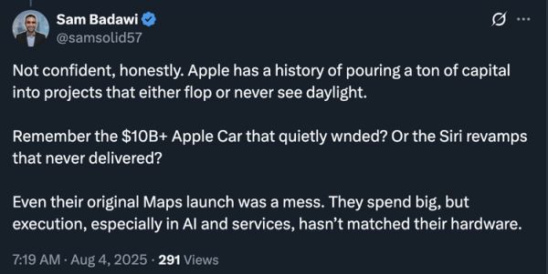 一位科技博主的评论反映了这种普遍情绪,“说实话,我没信心。苹果有过把大量资金投入到最终失败或从未面世的项目上的历史。还记得那个悄无声息就没了的、耗资百亿的苹果汽车项目吗?还有那些从未兑现的Siri改造计划?就连他们最初的地图发布都是一团糟。他们花钱很大方,但执行力,尤其是在AI和服务领域,一直没能匹配上他们的硬件。”