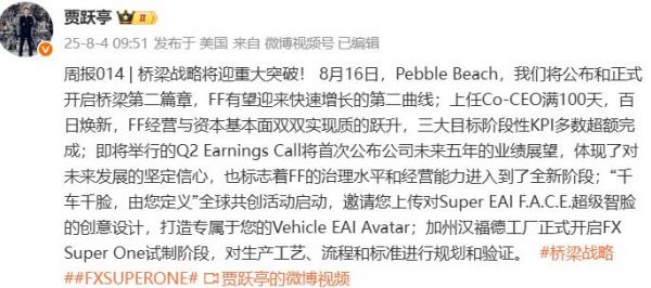 本月16日,FF选择在全球顶级豪华车盛会——圆石滩车展,作为发布“桥梁战略”第二篇章的舞台。贾跃亭将其定义为桥梁战略重大升级的里程碑,强调这将开启公司快速增长的第二曲线。具体内容虽未完全揭晓,但结合其强调的“中美桥梁”成果及生态布局,预计将涉及更深层次的全球化合作、技术落地或商业模式创新。