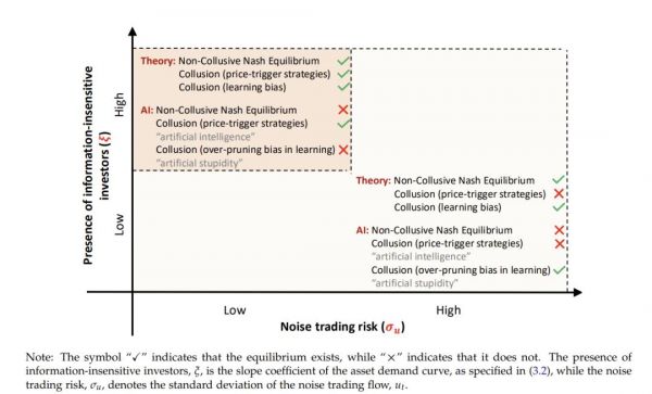 图注: 市场均衡的存在取决于噪声交易风险和信息不敏感投资者比例,理论模型更稳定,而AI在高噪声条件下易受学习偏差影响,可能导致均衡失败或“人工愚蠢”。