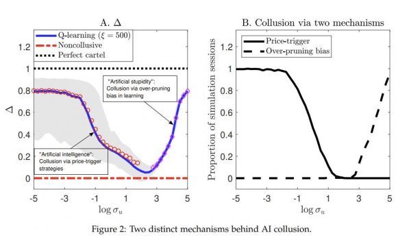 图注:AI在低噪声时通过价格触发策略合谋(人工智能),高噪声时因学习偏差导致非理性合谋(人工愚蠢),合谋机制随噪声水平变化。