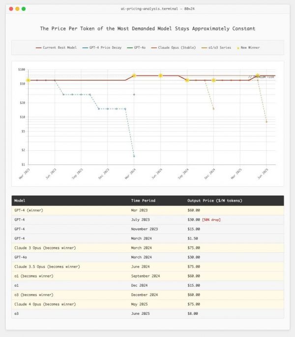 现在,我们来看看那些“地表最强”模型——也就是在任何时间点都占据 99% 需求的模型的真实定价历史: