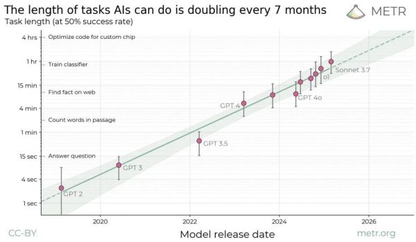 模型的进化,带来了一个谁也没预料到的结果:AI 能完成的任务的“长度”,每六个月就翻一番。过去返回 1000 个 token 的任务,现在能返回 10 万个。