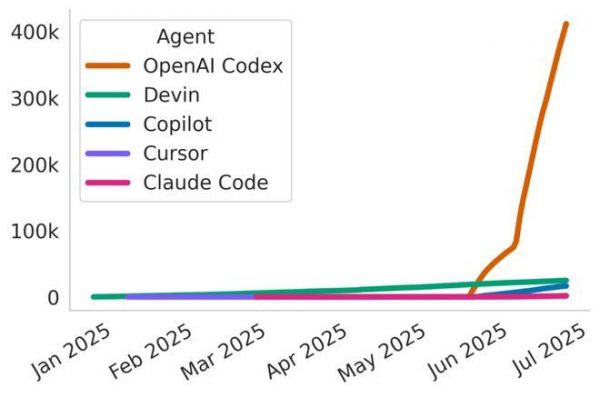 其中,OpenAI Codex表现最为活跃,提交PR达41万次(截止发文已达到80万次),堪称「卷王」;Devin和GitHub Copilot分别以2.4万和1.6万次提交紧随其后。