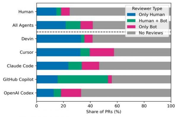 然而,新模式也引发担忧:研究发现,Copilot提交的代码通常由其「同门」AI 智能体(copilot-swe-agent[bot])初审,存在「自己人审自己人」的潜在审查盲点。研究团队建议,未来应探索建立更独立的评审机制以保障公正性。