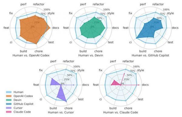 不过,AI在文档编写(docs)方面展现出独特优势。OpenAI Codex的文档类修改接受率高达88.6%,显著超过人类的76.5%。研究推测,文档生成更依赖语言能力而非复杂逻辑推理,这正契合当前大语言模型的核心优势。