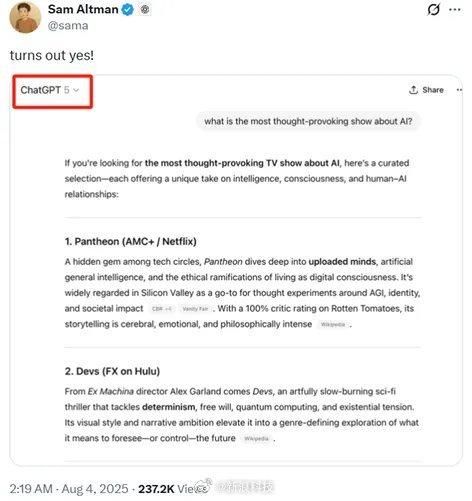 此次展示的问答内容涉及推荐与人工智能相关的电视剧,GPT-5的回答与现有模型相比并无显著差异,但据爆料,GPT-5在代码生成和商业化能力方面有显著提升。Altman还提到,GPT-5的发布将引领SaaS行业进入“快时尚时代”,预示着该模型将为软件即服务领域带来变革。(三言科技)