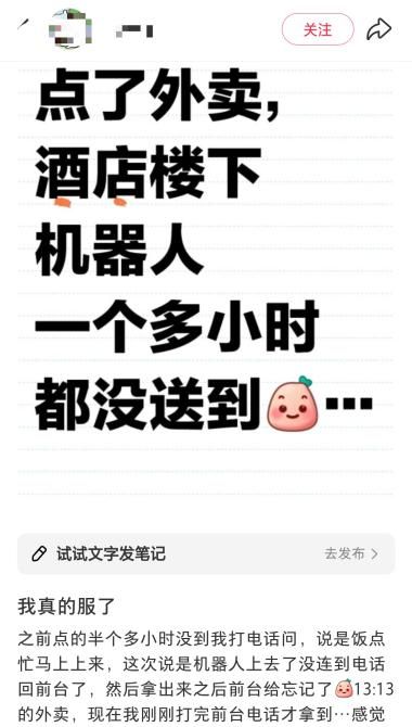 它们只能送拖鞋、外卖、毛巾,路线固定,互动时基本靠扫码或按键,且机器味十足。经常能在社交平台上看到消费者对酒店机器人的吐槽,例如:躲避障碍能力弱、声音吵……