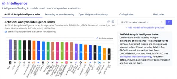 图:Artificial Analysis的AI模型智能排行榜