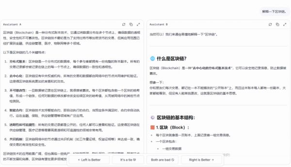 匿名标注为Assistant A和Assistant B两个模型生成的答案会并排显示,而用户需要根据自己的判断,投票选择最合适的回答。