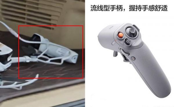 在机器的旁边还有一个白色的配件,从形状来看应该是它的遥控手柄(上图左)。这个手柄长得很像大疆无人机的穿越摇杆(上图右),所以它八成也会有体感操控无人机的功能,看来玩法还挺丰富的。