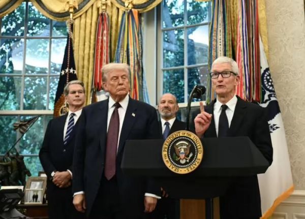 图源:IT之家值得一提的是,就在当天,苹果公司CEO 蒂姆・库克 (Tim Cook) 与特朗普在白宫椭圆形办公室宣布了一项 1000 亿美元的新投资计划。计划是将在未来四年向美国公司和供应商额外投入,加上前段时间的 5000 亿,就是 4 年 投入 6000 亿美元了。