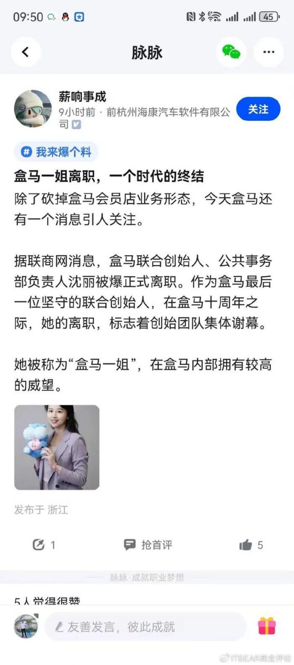 盒马最后一位联合创始人沈丽离职