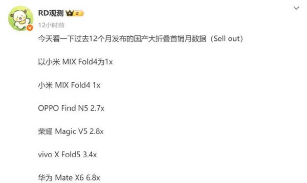 博主RD观测盘点过去12个月国产大折叠屏手机首销月数据,以,小米MIX Fold4作为1倍基准!