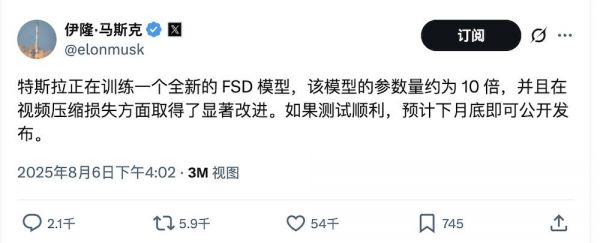就在昨天,埃隆·马斯克在X上说,特斯拉正在培训一个升级的全自动驾驶(FSD)模型,该模型参数量可能是现有模型的10倍,视频压缩性能也会得到改进。马斯克预告说,全新模型可能在下个月发布。