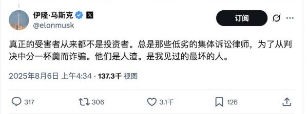 对于这项指控,马斯克迅速在社交平台X上回应,他将矛头直指发起集体诉讼的律师,称:“为了从判决中分一杯羹而行骗的集体诉讼律师,是最坏的人。”