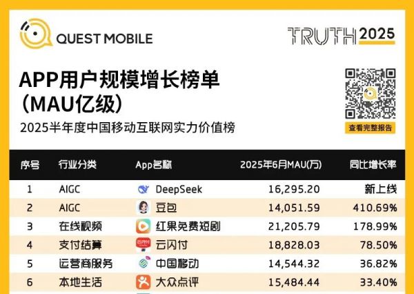 根据QuestMobile2025半年度中国移动互联网实力价值榜,2025年6月,豆包在APP用户规模增长榜单(MAU亿级)上位列第二,以同比410.69%的同比增速创下增长奇迹。比背靠腾讯的元宝(月活2480.48万)足足多了一个亿。