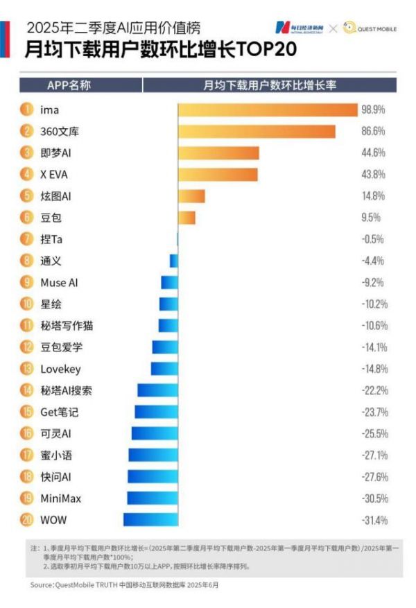 根据QuestMobile推出《2025年二季度AI应用价值榜》,DeepSeek月均下载量从第一季度惊人的8111.3万降至2258.9万,降幅高达72.2%。而和抖音生态深度绑定的豆包以2981.3万月均下载量领跑,曾经搭上DeepSeek便车一度IOS下载榜压过豆包的元宝,并未出现在月均下载用户环比增长TOP20榜单中。