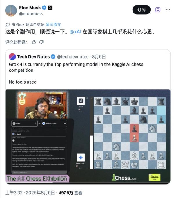 面对 Grok 4 的强势发挥,实时追更赛况的马斯克也是「装」起来了:「xAI 在国际象棋上几乎没花什么心思。」