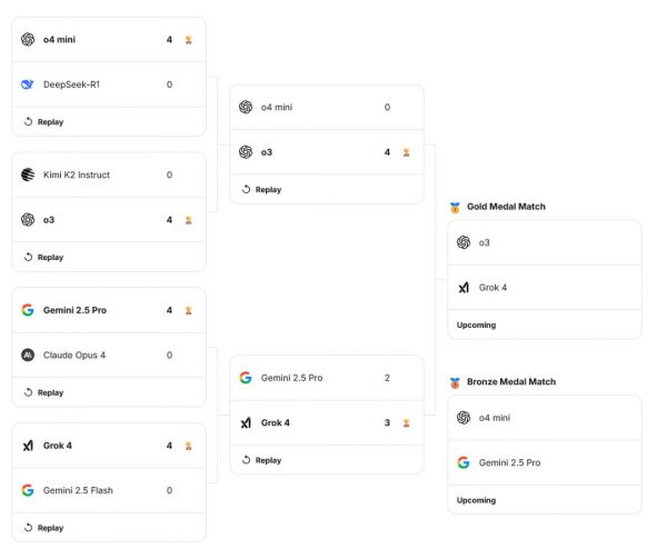 今天最新的比赛结果已经出炉:o3 和 Grok 4 挺进决赛,而 o4 mini 和 Gemini 2.5 Pro 则将为铜牌展开最后一战。