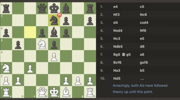 Gemini 开局气势如虹,皇后深入腹地制造多重威胁,一度占据明显优势。然而,在关键时刻,Gemini 的皇后走到了一个完全不设防的位置。