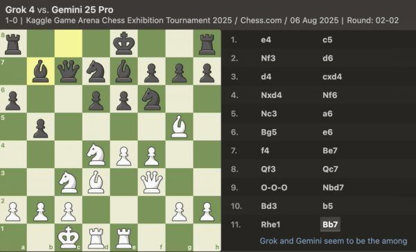 随后的局面更是一边倒,Grok 在短短几步内就丢掉了皇后,Gemini 轻松获胜。