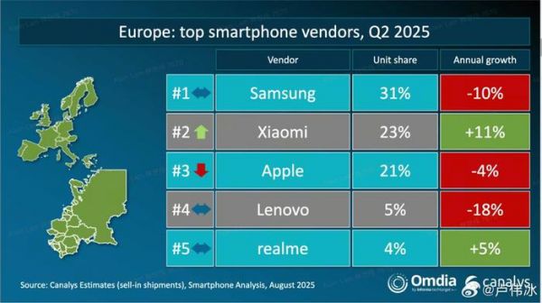 图中显示,2025年第二季度欧洲智能手机市场中,三星以31%的市场份额位居第一,但其年度增长率为-10%;小米以23%的市场份额紧随其后,并且年度增长11%;苹果以21%的市场份额排名第三,但其年度增长率为-4%;联想的市场份额为5%,年度增长率为-18%;realme则以4%的市场份额和5%的年度增长率位列第五。