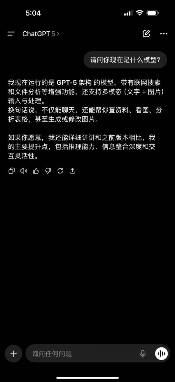 需要注意的是,即便你的ChatGPT界面出现了GPT-5版本,也可能不是真正新版。我们在体验中发现,在PC端问GPT-5是哪个模型,它会回答自己的GPT-4o,回答的效果也是旧版。