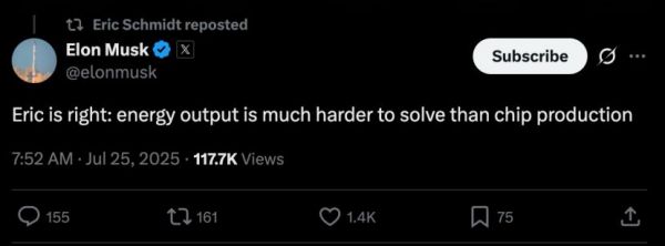 这个观点,当时很快引来了马斯克的围观赞同,他在X上评论说:Eric是对的,能源输出比芯片生产更难解决。