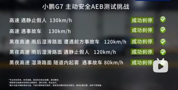 小鹏G7则在发布会上演示了对AEB功能(自动紧急制动系统)的测试,在130km/h的高速行驶状态下,遇到静止假人和事故车后成功刹停。根据测试结果,在120km/h的速度下,哪怕是黑夜高速,在雨后湿滑路面遭遇前方事故车,同样实现了刹停。
