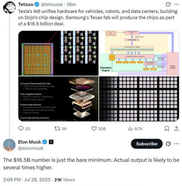 特斯拉上个月与三星达成了一项价值165亿美元(约合人民币1182.9亿元)的协议,以确保其AI半导体供应持续到2033年。其计划在德克萨斯州新建一家工厂,生产特斯拉的下一代AI6芯片,从而使特斯拉的采购渠道更加多元化,不再局限于采用台积电芯片。