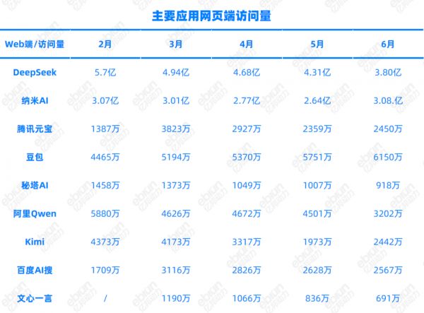 DeepSeek移动端月活从年初一路上涨至5月,首次MAU破亿,6月开始下跌至9000万月活。Web端则在2月达到5.7亿次访问量后一路下跌,6月维持在3000万访问量。