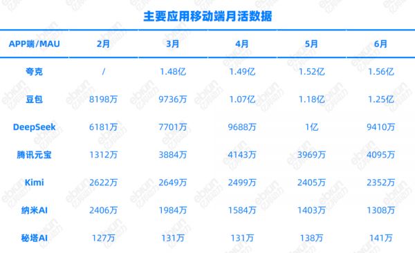 在激进投流下,夸克和豆包都维持了始终的上涨趋势。夸克APP端的月活从2月的1.48亿增至6月的1.56亿;豆包月活在4月首次破亿,此后也维持每个月双位数增长。
