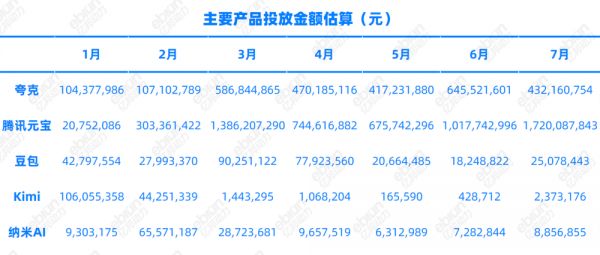 如果说2024年是Kimi和豆包的流量之战,那么2025年上半年,这场战争的主角轮到了夸克和元宝——夸克每个月的广告投放金额均破亿,最高投放出现在6月;元宝6月、7月投放金额均超10亿元。