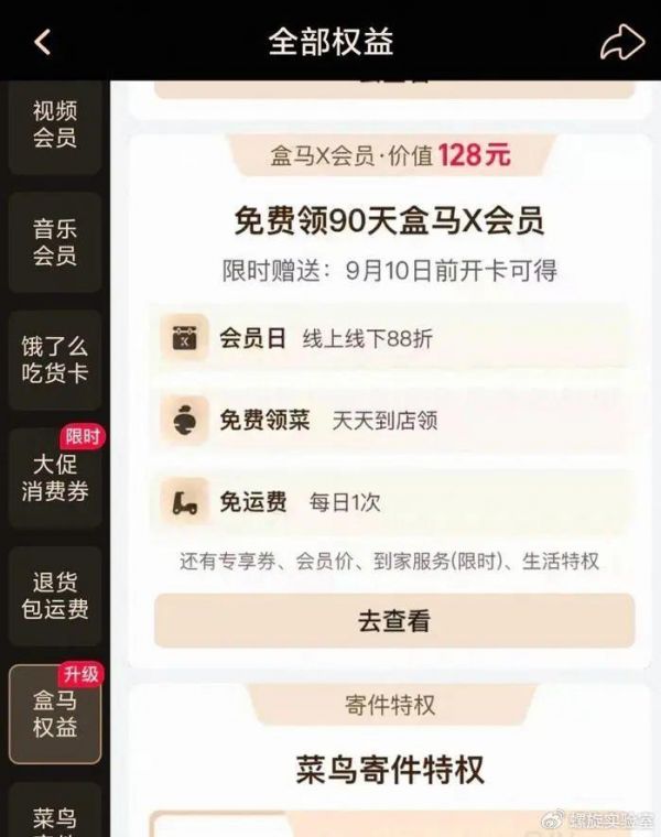 尽管不同等级会员的权益有所差异,但都统一整合了饿了么、飞猪等业务,将用户的权益范围从线上购物拓展至餐饮外卖、旅行预订等更多生活消费场景。这也是淘宝会员体系首次与盒马进行打通,原88VIP用户还能免费领取90天盒马会员。