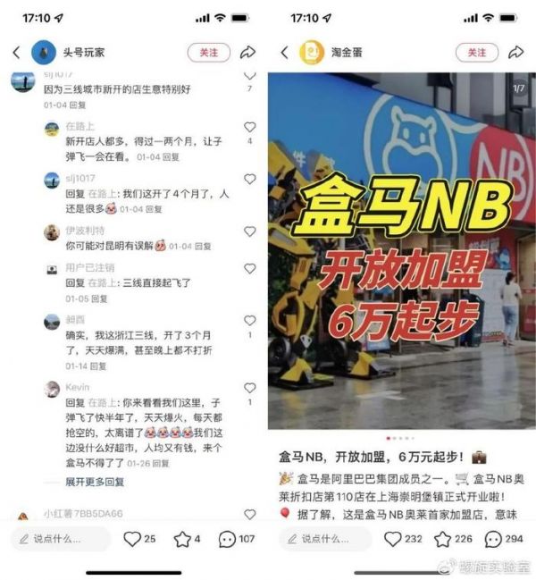 有网友在社交媒体发文,网传最低6万元起即可开出一家盒马NB店。盒马方则没有透露具体费用,其称不同地区加盟费用不同。