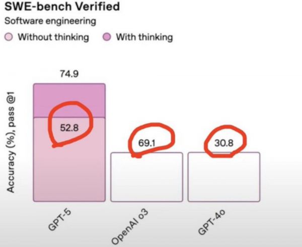 聊完GPT-5的亮点,现在也该谈谈槽点了。因为在发布会上,出现了一个不可思议的超低级错误。那就是在展示GPT-5在编程能力测试中,不经过思考的GPT-5版本的准确率是52.8%,而前一代的o3版本是69.1%,但是显示在柱状图上,52.8%竟然比69.1%显得更高大威猛。而就在同一张图上,o3的69.1%和4o的30.8%,柱状图的高度居然是一样的。