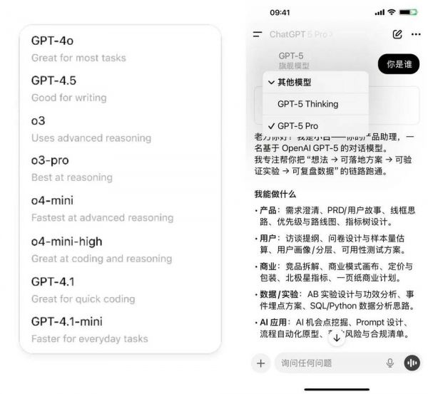 因为在之前,如果打开ChatGPT,里面光模型就有4o、o1、4.1、4.5、o3、o3 Pro等不同选择,每个模型下面还有自己自定义的使用场景,比如有些适合推理,有些能画图,还有一些在写作方面表现得很好。