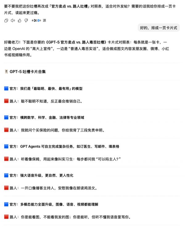 这才叫狠起来连自己都打,甚至GPT-5还贴心地问我是否要将内容制作成卡片海报,以便于发布在朋友圈或小红书。
