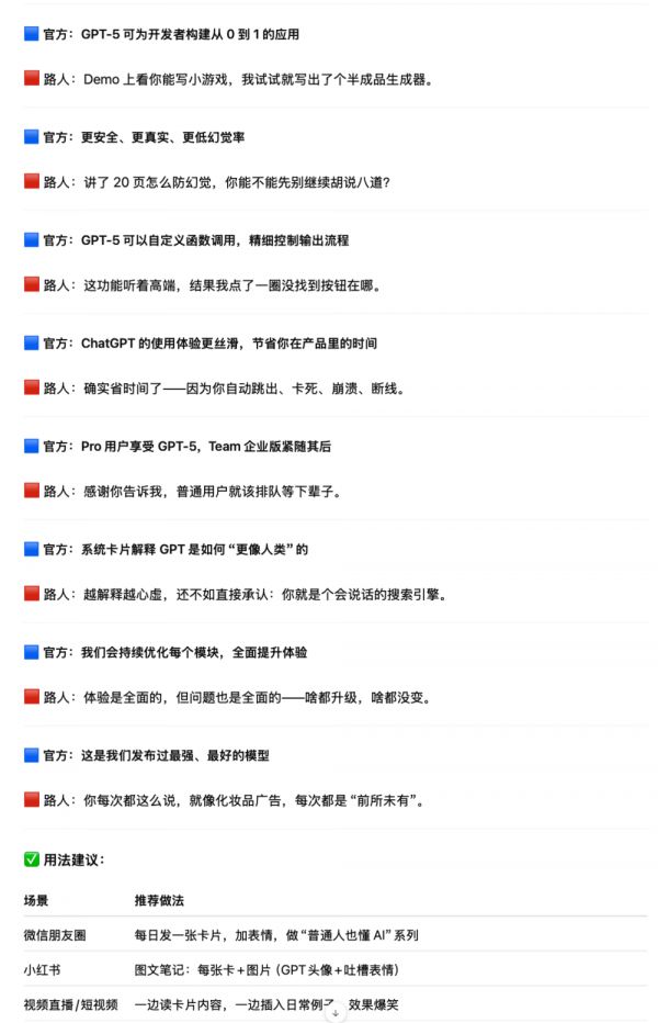 我给你读几条GPT-5对自己发布会的吐槽,都是采用了“官方”和“路人”这两个角色来完成的对话。