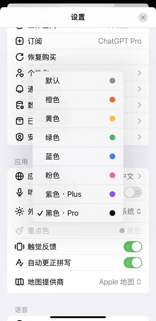 在最新更新的ChatGPT手机App里,增加了一个设置选项,叫“重点色”。里面默认灰色,还提供了橙色、黄色、绿色、蓝色、粉色五个免费颜色。每月20美金的Plus会员才能用紫色,每月200美金的Pro会员才能用黑色。