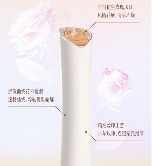 据客服介绍,玫瑰空调采用分布式送风技术,相比其他柜式空调,其特别之处在于通过隐藏风口花瓣送风。其他还包括支持0.5℃精准调温、-35℃-60℃宽温运行、AI语音、WiFi智能控制等功能。