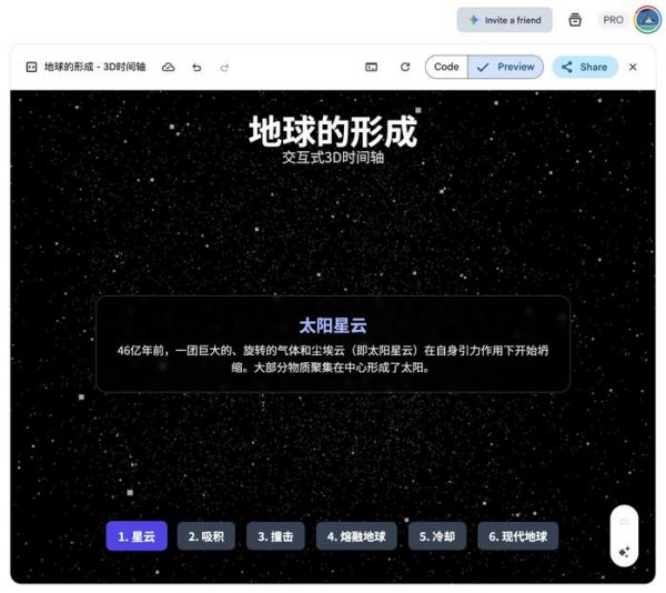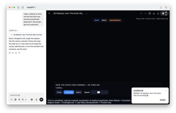 Gemini 生成网页,图片来源:雷科技同样让 Gemini 2.5 Pro、DeepSeek R1、豆包(深度思考)和 GPT-5 生成一个用 3D 模型展示「地球如何形成」网页,Gemini 2.5 Pro 不论从速度、生成质量来说都是最好的,DeepSeek R1 生成质量比较一般,但至少可正常预览运行,豆包只是生成了一个没有 3D 模型网页,GPT-5 则遇到了明显的运行错误。