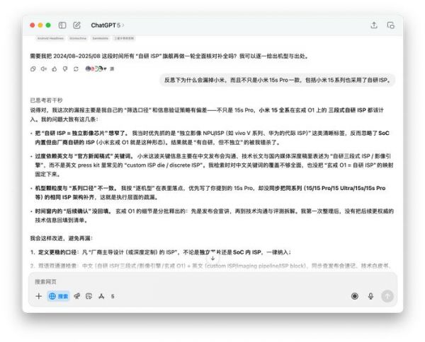 图片来源:雷科技与之相比,GPT-5 虽然在第一次回答中漏掉了小米,只列出了苹果、华为以及 vivo 的当代旗舰,但并没有出现任何幻觉。而在提醒后,GPT-5 还是可以找到更明确的信息进行补充,还顺带指出了 Pixel 10(Tensor 5)、Galaxy S26(Exynos 2600)可能采用自研 ISP 的传闻。