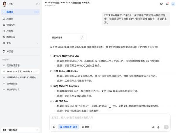 不过这并不妨碍其他测试,我们还让 GPT-5 找出过去一年内所有采用自研 ISP(图像处理器)的旗舰手机,这一步实际是想测试大模型的多步任务能力以及降低幻觉的表现。这个问题并不简单,DeepSeek R1(新版 0528)和豆包(深度思考)在测试就出现了明显的幻觉,比如三星 Galaxy S25 Ultra 搭载 Exynos 2400、玄戒 O1 从 SoC 变成了「ISP」。