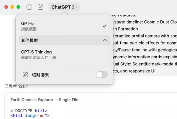 而从目前的初步体验来看,GPT-5 确实可以比较完美替代过去的 GPT-4o、GPT-4.5 以及 o3 等所有推理模型,并且自动切入思考(推理)的体验也做到了相对顺滑和一致的体验。、